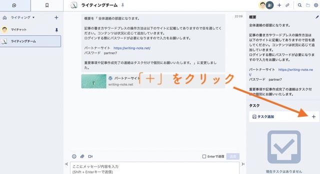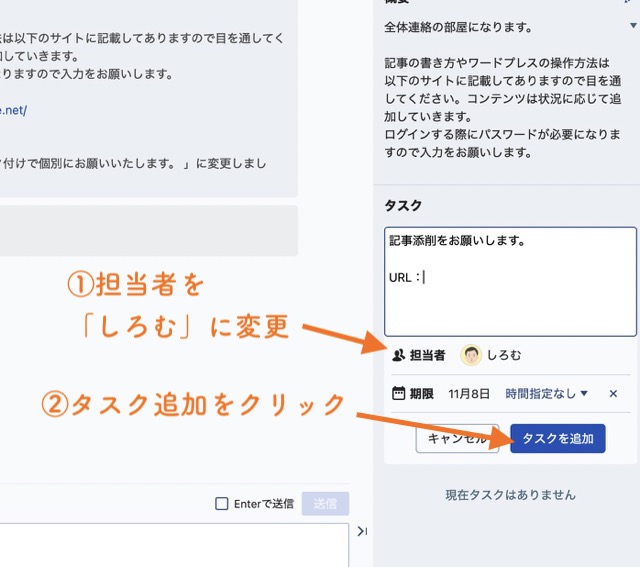 記事が仕上がりましたら個別チャットにタスクをつけて連絡ください。
