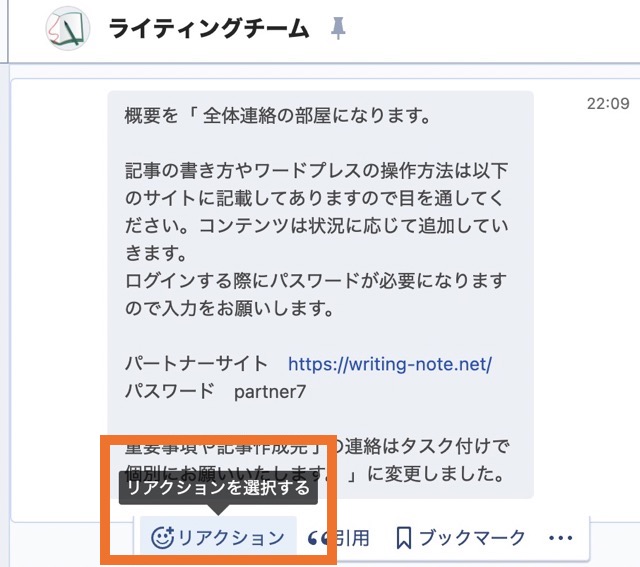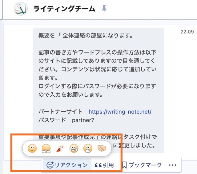 確認するだけで返信のいらないやりとりに関しては「リアクション」をしていただけるとありがたいです。
